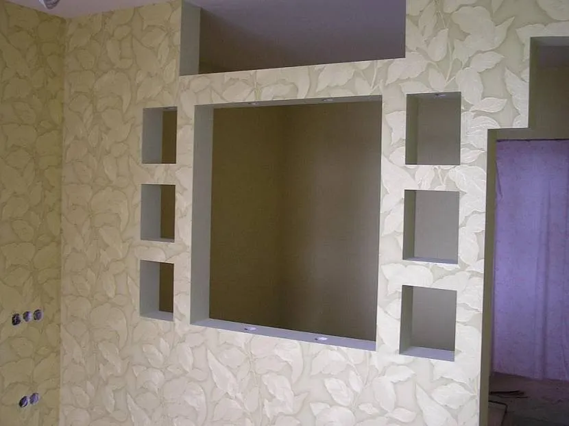 С этой задачей вполне справиться ступенчатая конструкция, которую можно использовать в качестве полок. Для ее изготовления берется широкий профиль, из которого изготавливается каркас. Собранную основу обшивают гипсокартоном, формируя ниши нужной формы и размера.