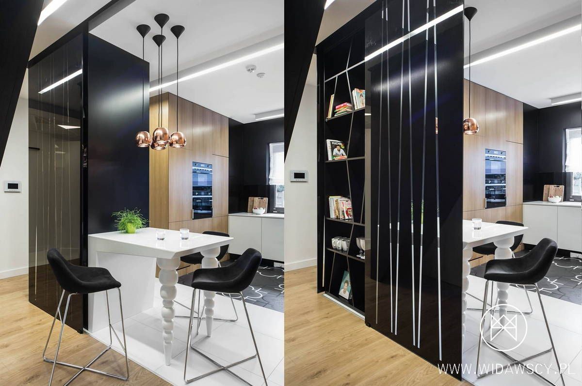 Однако, существуют некоторые специфические способы применения раздвижных дверей. На примере мы видим довольно оригинальный шкаф, раздвижная створка которого может отодвигаться и закрывать обеденный стол в кухне, а сам шкаф способен превращаться в открытый дизайнерский стеллаж.