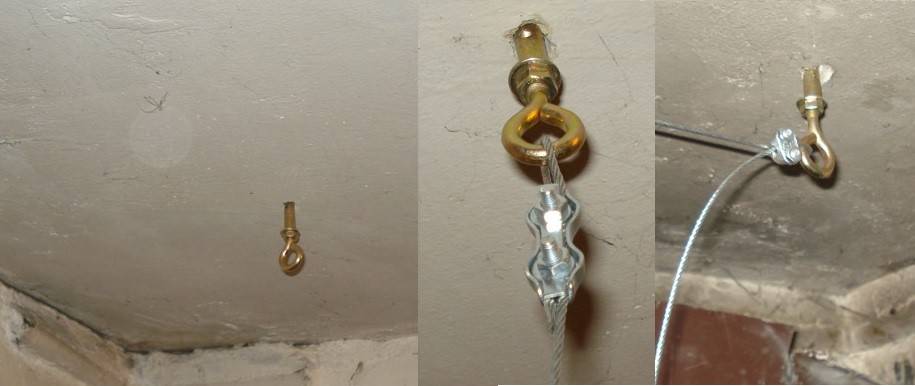 - На потолке с одной и с другой стороны на расстоянии 30-50 см от угла сверлим отверстие в перекрытии, вкручиваем анкера.