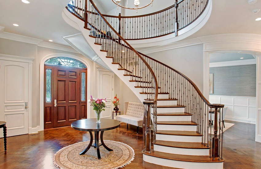 Классический стиль – подразумевают простые точные формы и отсутствие сложных декоративных элементов, но зато питает слабость к лепнине и бронзе. Лестница с бронзовыми балясинами в виде простого витого прута и патированными перилами превосходно вписывается в классический декор. На фото представлен описанный образец.
