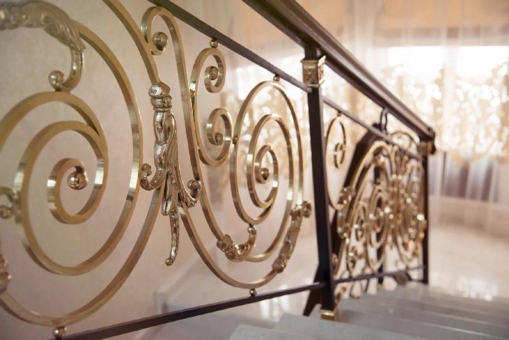Модерн – склонность к изгибам и плавным переходам без пышности и яркости, требует более скромных форм. Для стиля модерн ограждение внутри здания чаще изготавливается путем холодной гибки или сварки с включением отдельных кованых элементов. При этом модерн предполагает довольно большую свободу в цвете и даже предпочитает яркие оттенки. На фото представлена кованая лестница на второй этаж с перилами под «золото».