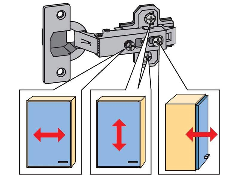 За плотность прилегания створки отвечает дальний от чашки винт, за смещение по горизонтали самый ближний. Вертикальное положение изменяется с помощью двух шурупов , расположенных друг над другом, или одного регулировочного винта в центре монтажной планки , если петля со скрытым креплением.