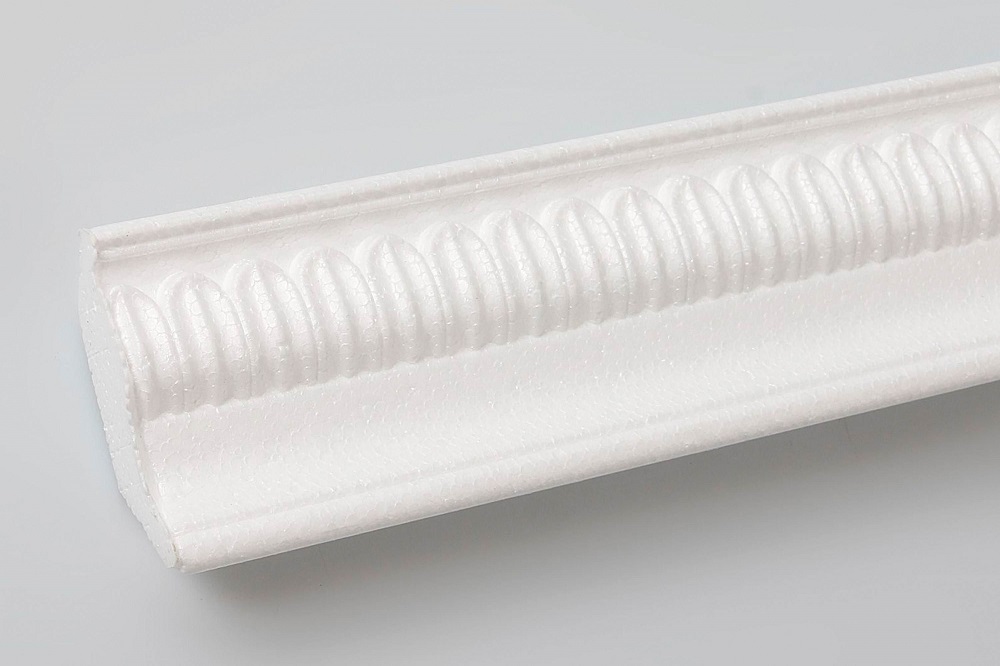 Материал схож с пенопластом: его также изготавливают из небольших гранул. Однако, они прилегают друг к другу более плотно. Для работы с пенополистиролом требуется острый инструмент. Плохо заточенным лезвием потолочный плинтус из этого материала правильно разрезать не получится, он начнёт крошиться.