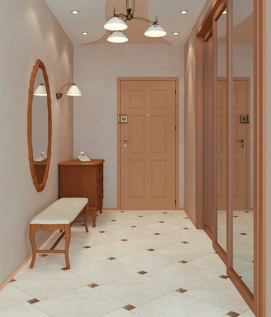 Оптимальный выбор – плитка с мелким узором, которая будет уютно выглядеть в просторном холле и органично впишется в компактный коридор.