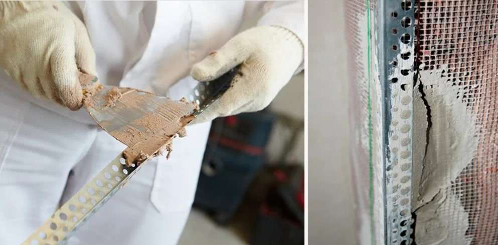 Технология обработки внешних и внутренних углов различается. Для наружных углов применяются специальные перфорированные профили из оцинкованной стали или пластика. Они позволяют усилить стык двух листов и придать углу правильную геометрию.