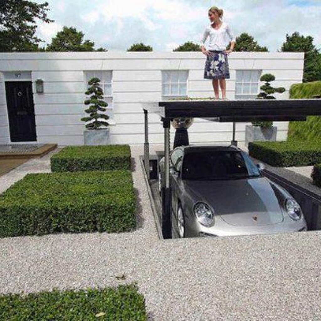 На участках, где нет возможности построить отдельный длинный заезд с приемлемым углом наклона проезжей части, зачастую устраивают лифт, позволяющий поместить машину в гараж практически не сходя с места.