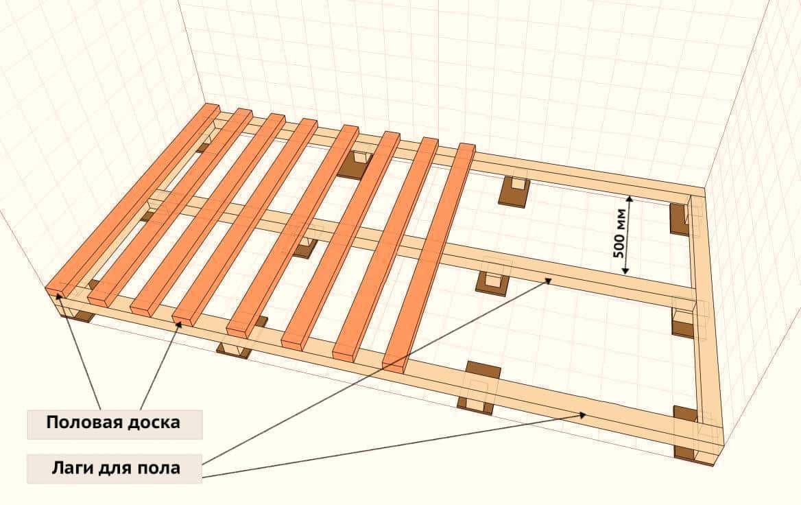 Рекомендуемое расстояние между лагами пола составляет 500 мм