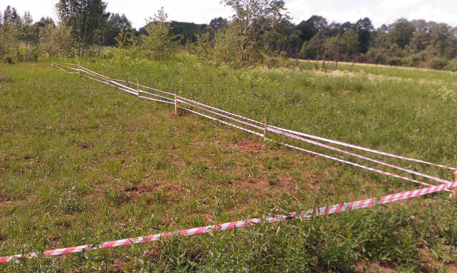 - Между лунками укладываем брусок, а затем поднимаем вместе панель и смонтированные опорные элементы. Столбы устанавливаем в лунки, подставив сетку на бруски. Вблизи каждого столба дополнительно сетка фиксируется подручными материалами.