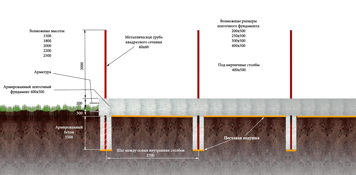 Кроме этого, можно просто забетонировать вертикальные стойки забора, изготовив для них гнезда в грунте глубиной 70-80 см. Таким способом решают вопрос многие пользователи, но оптимальным вариантом этот способ назвать нельзя, так как он имеет массу недостатков. Основной из них — довольно большой объем земляных работ. Этот минус свойственен и ленточному фундаменту.
