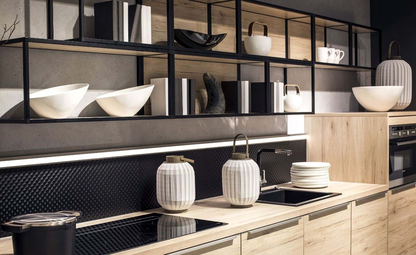 Если на кухне в качестве материала для полок используется натуральная древесина, её поверхность должна быть надежно защищена средством, устойчивым к влаге и перепаду температур