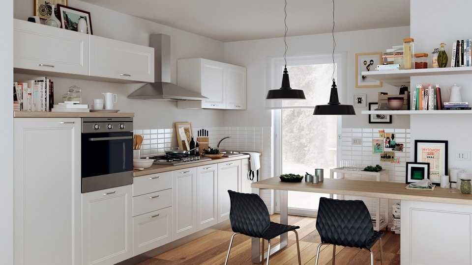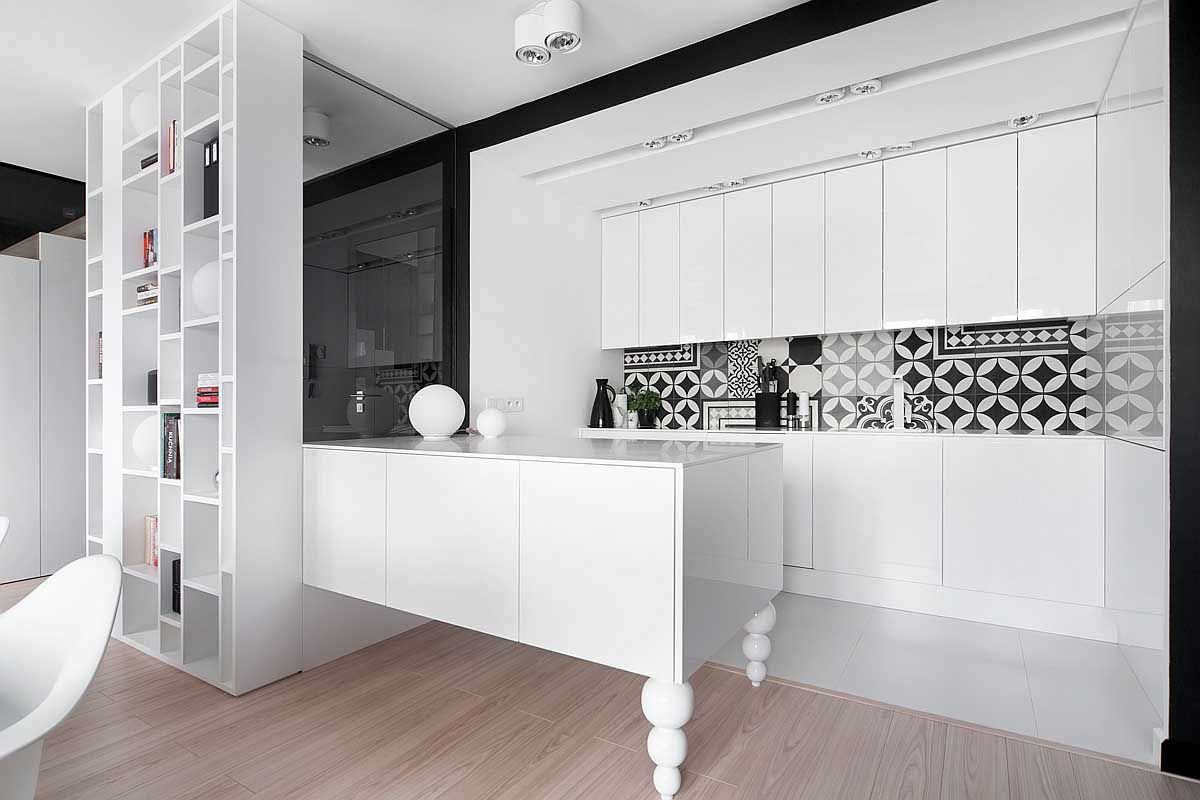 На фото сквозной стеллаж белого цвета, отделяющий кухонную зону от гостиной.