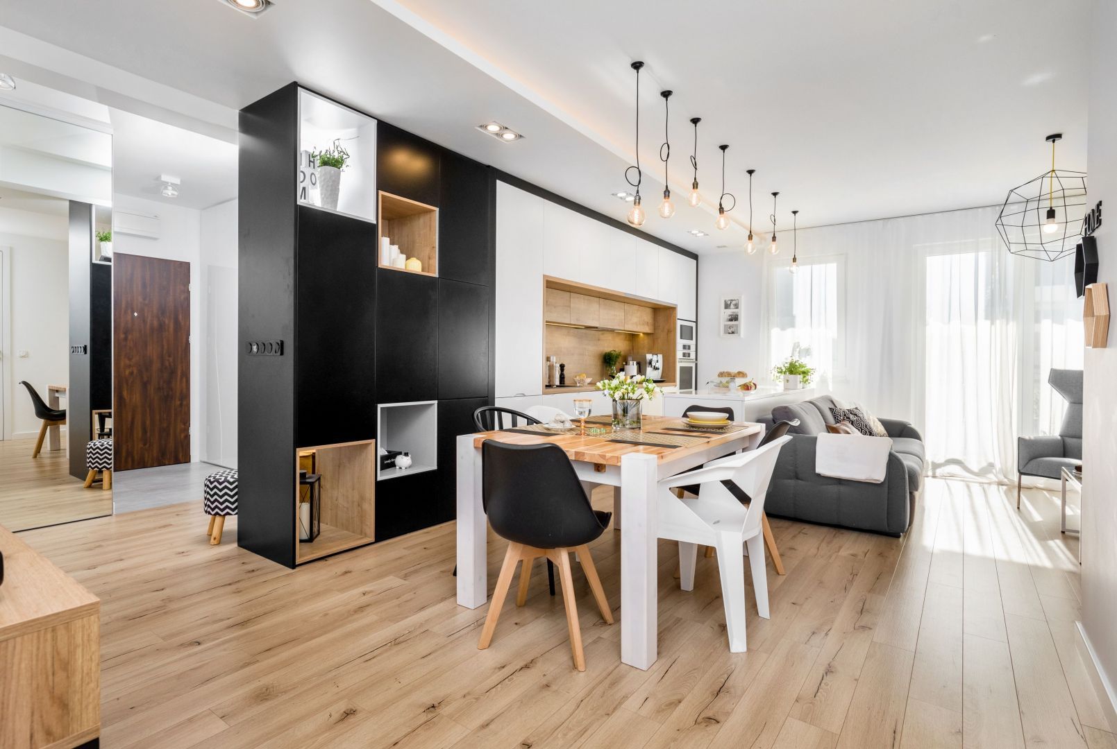 Прихожая находится рядом с кухней-гостиной, чтобы явно провести границу был установлен большой односторонний стеллаж. Полки выходят на сторону кухни, а со стороны прихожей гости видят обычную стену.