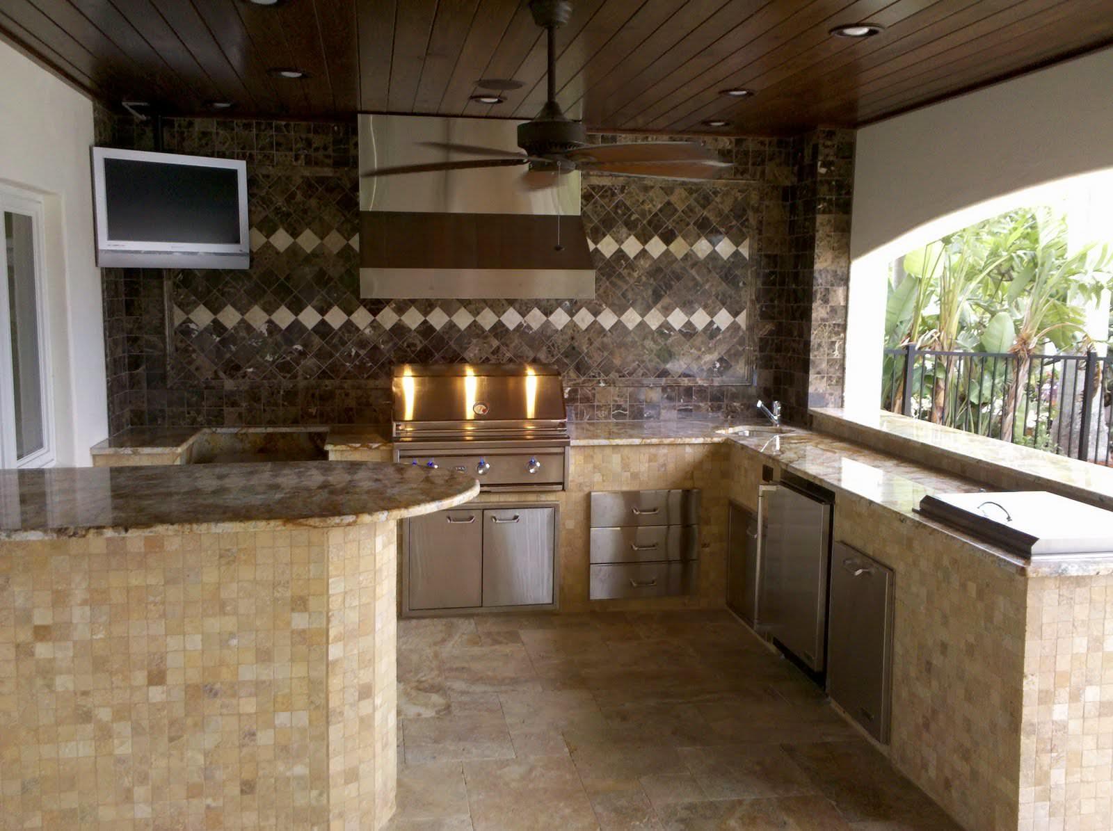 Внутренняя отделка летней кухни. Когда все крупные работы по монтажу стен и крыши выполнены, можно приступать к отделочным работам изнутри. В этом вопросе также нет никаких строгих правил. Например, кирпичную кладку можно сделать под расшивку. Если желаете, то стены можно поштукатурить, а после прошпаклевать. Проверьте состояние тротуарной плитки. Каждый шов должен быть заполнен затиркой.