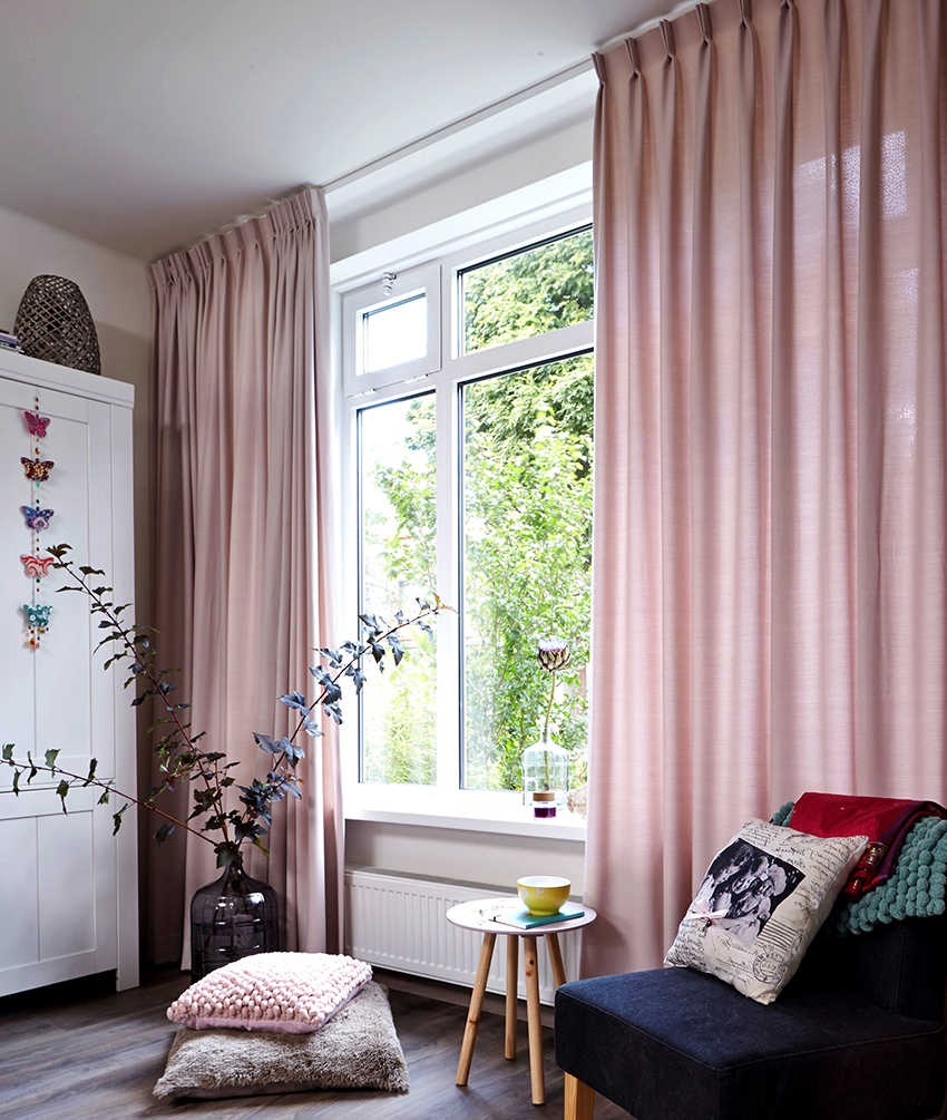 Вторым путем крепления становится монтаж на потолок. Одним из положительных моментов стало то, что это исполнение зрительно увеличивает высоту комнаты. А это прекрасный вариант для квартир небольших габаритов. Некоторые современные дизайнерские решения в таком случае могут превратить стену с окном в сплошную штору. И, конечно, крепление на потолок набирает популярность в связи с ростом популярности натяжных потолков.