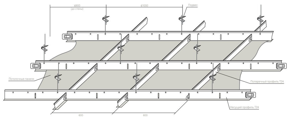 Подвес представляет собой две струны, на конце одной – петля для шурупа, на конце второй – крючок. Струны соединяются с помощью лепестка-бабочки с 4-мя отверстиями. После крепления несущих профилей, через 1,2 м начинаем крепить поперечные профили Т24 или Т15 длиной 1,2 м и 0,6 м – они вставляются в специальные прорези в несущих профилях. При этом должна образоваться каркасная конструкция в виде клеток с ячейкой 600х600 мм.