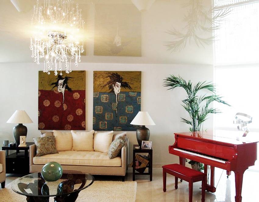 Глянцевый потолок очень хорошо сочетается с декоративными элементами интерьера, а также освещением.