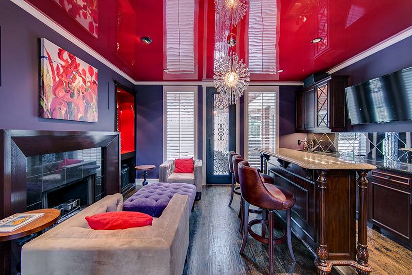 Для создания уникальных интерьеров используйте «двухстороннее» натяжное полотно. Это замечательная возможность не только комбинировать цвета, но и экспериментировать с различными зрительными эффектами. Если хотите зрительно увеличить высоту помещения, а натяжной потолок уже «съел» драгоценные сантиметры, в этом случае дизайнеры советуют оформить в одном цвете стены и нижний уровень покрытия. Благодаря технологии спайки нескольких цветных полотен даже очень большое помещение будет смотреться уютным. Так, просторная гостиная, к примеру, станет и местом отдыха с телевизором и диваном, и игровой, и столовой. Весомый плюс – возможность решить вопрос сочетаемости пола, потолка, стен и мебели.