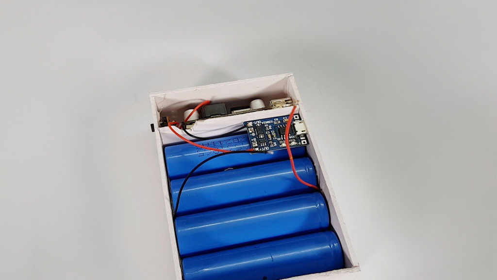 После сборки схемы и изготовления корпуса, остается лишь аккуратно собрать прибор. Контакты для параллельного соединения батарей в виде пружинок и стальной проволоки крепятся в специальных пазах в боковых стенках корпуса. Модуль TP4056 крепится в левом верхнем углу, где расположен проем для USB разъема. Повышающий модуль также размещается сверху и подключается выходящим USB портам.