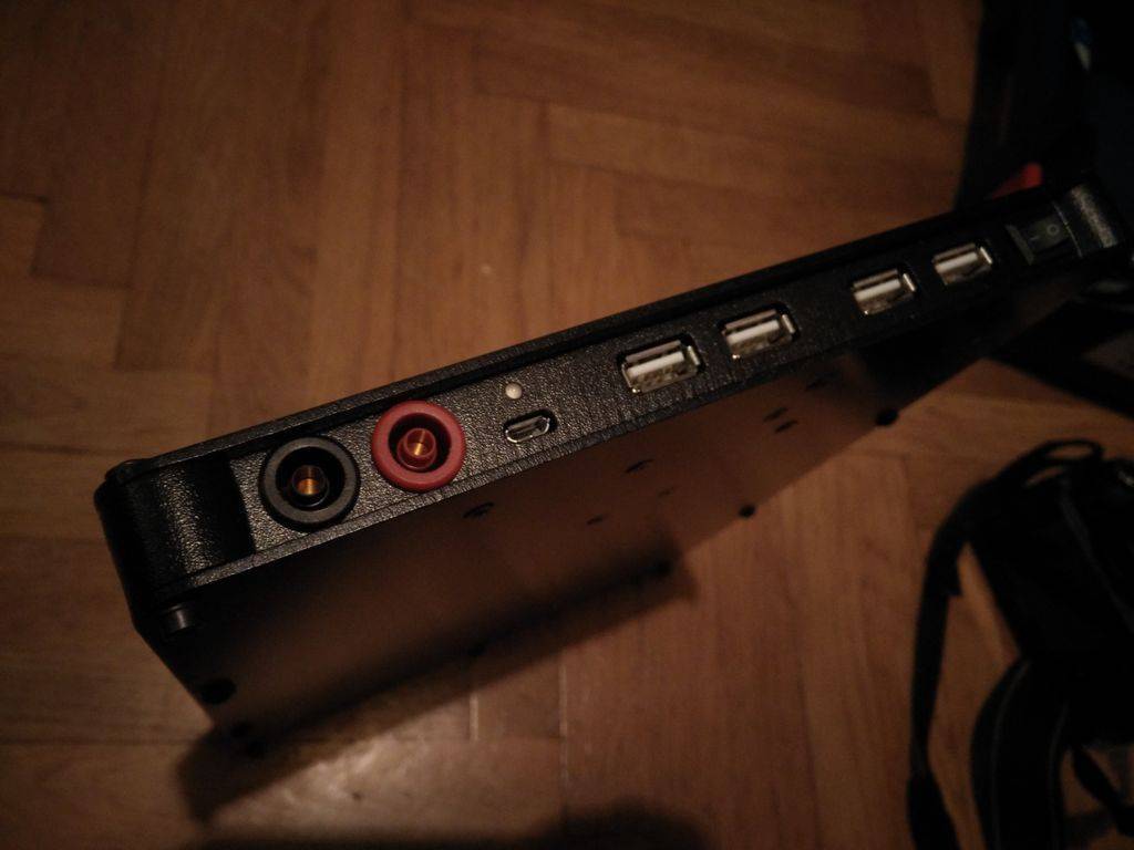 Внутри корпуса установлен штатный контроллер зарядки, на внешней стороне предусмотрены порты USB, рассчитанные на ток 1 и 2 А. Для зарядки элементов имеется отдельный вход, снабженный контрольным диодом. Для поддержания выходного напряжения на уровне 4,85-5,0 В используется штатный регулятор. В конструкции предусмотрен регулятор зарядки элементов, автоматически разрывающий цепь питания.