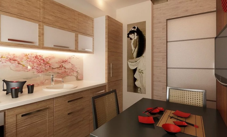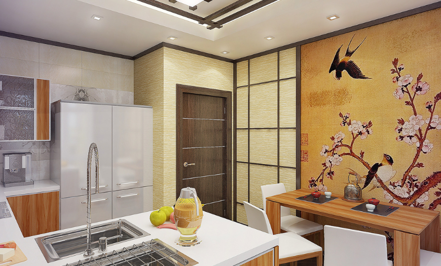 Это природные цвета, низкая мебель самых простых форм и декор, соответствующий классической японской стилистике. Это могут быть росписи на фасадах, иероглифы, изображения самураев, японское оружие или веера на стенах. Материалы используются только натуральные.