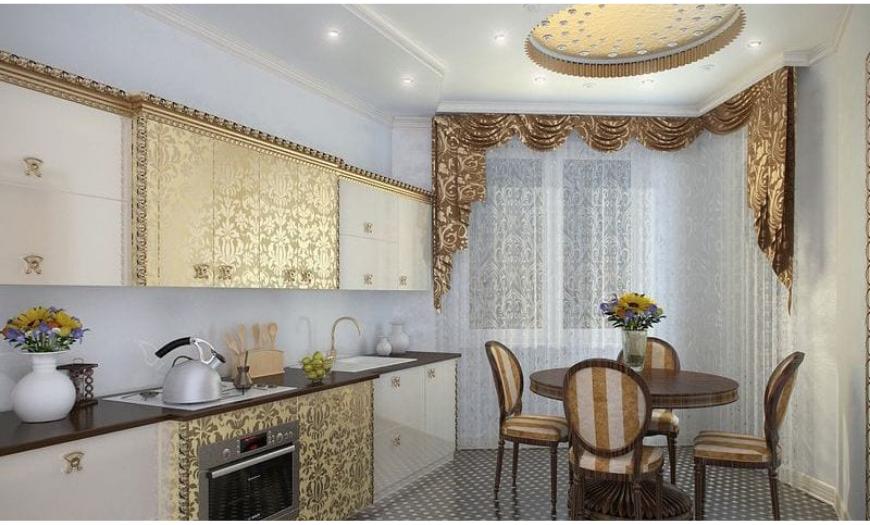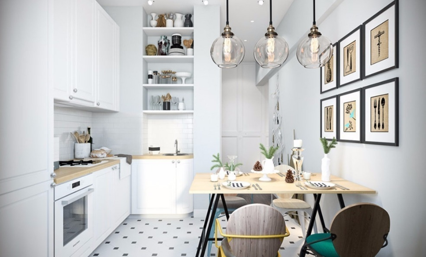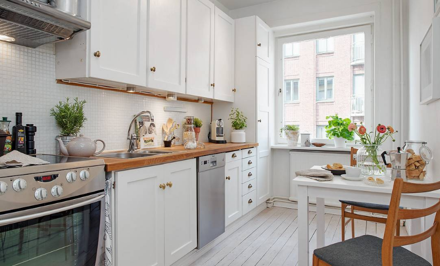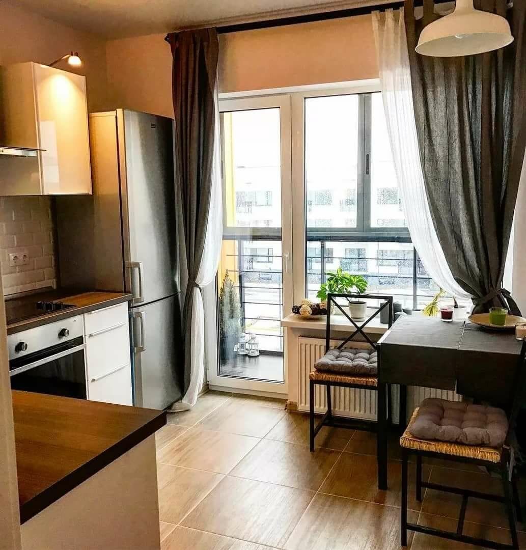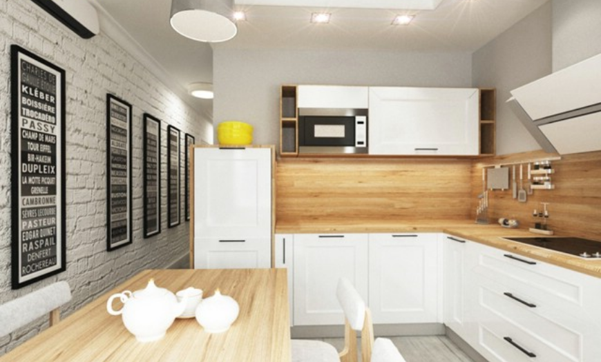 В дизайне кухни 9 квадратных метров используется плоская и легкая модель телевизора, которая вешается на стену, гарнитур закрепляется на фасаде или встраивается в него. Телевизор также можно разместить в свободном углу, который будет виден из любой точки комнаты.
