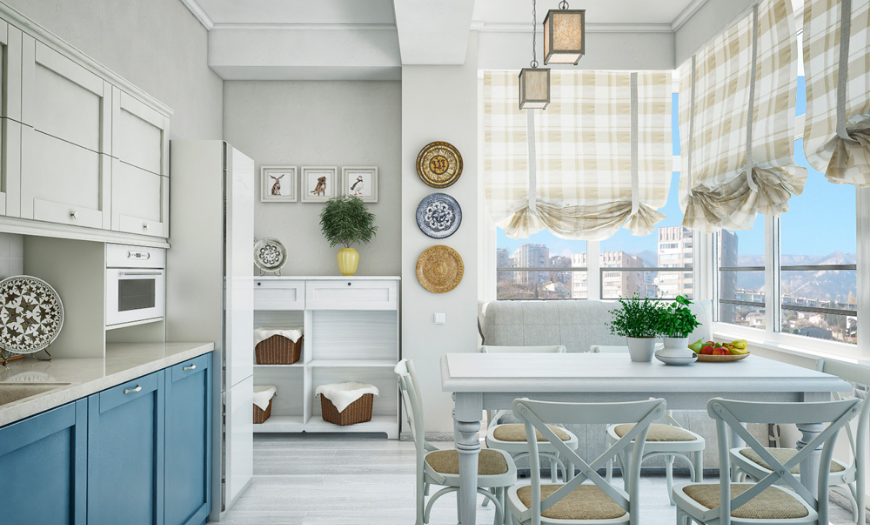 Создать такой стиль на своей кухне можно даже при небольшом бюджете на ремонт. В отделке используются преимущественно натуральные материалы, а также при изготовлении мебели. Но на некоторых вещах можно сэкономить. Например, для облицовки стен и потолка подойдет побелка или краска.