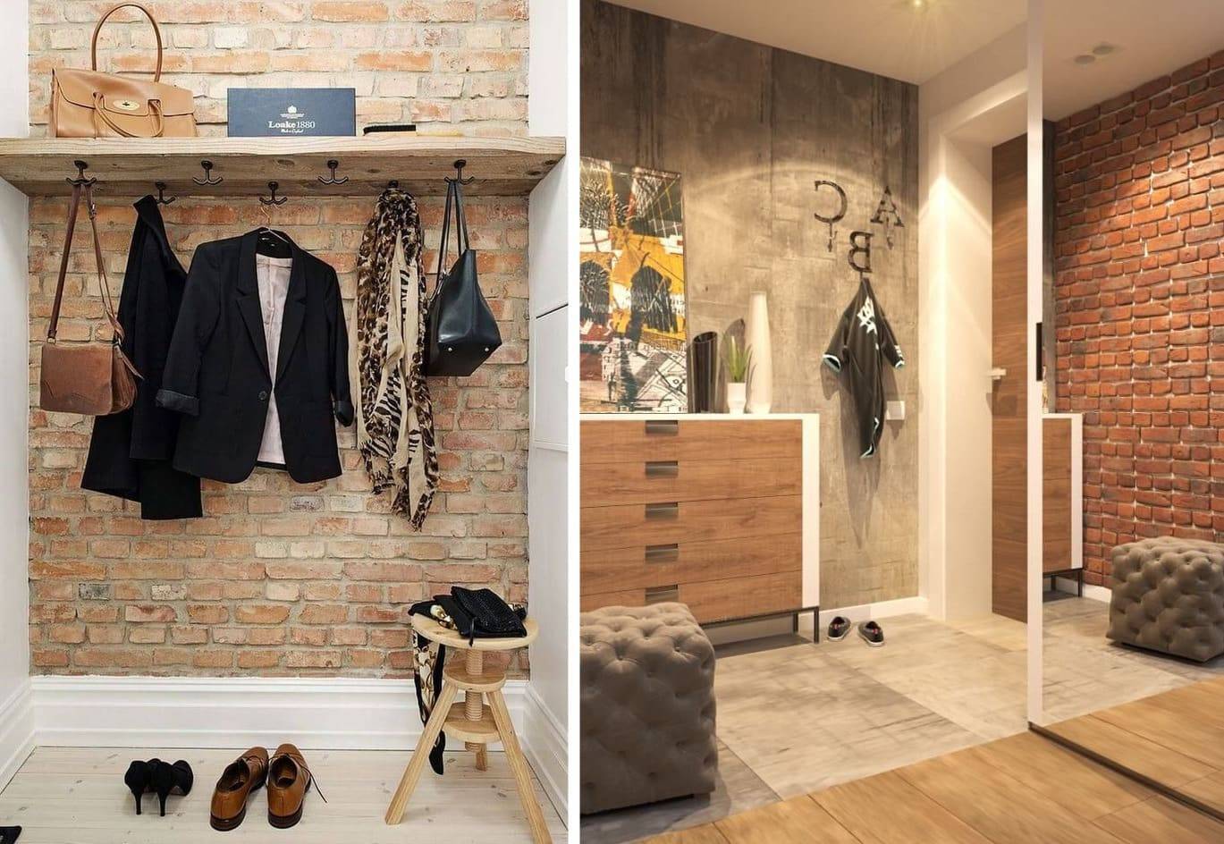Не теряет своих позиций отделка декоративным кирпичом и штукатуркой, но она будет лучше смотреться в больших прихожих, где есть необходимость зонирования и можно не бояться, что отделочный материал «украдет» определённое количество пространства.