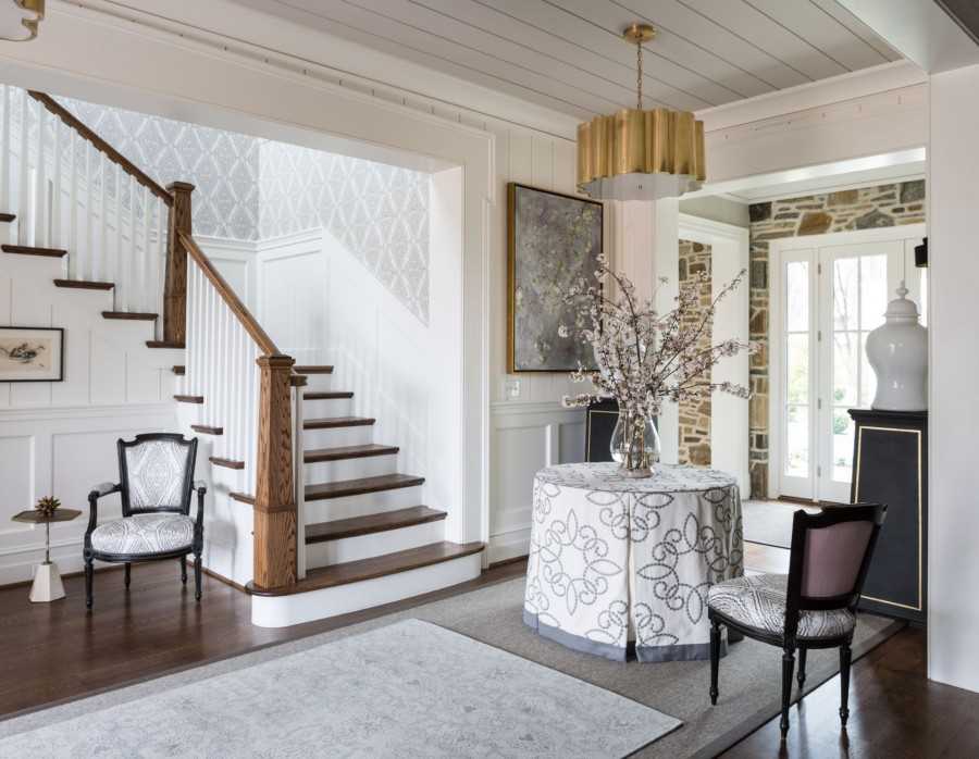 В частных строениях размеры и высота прихожих позволяют создавать интересные и запоминающиеся проекты