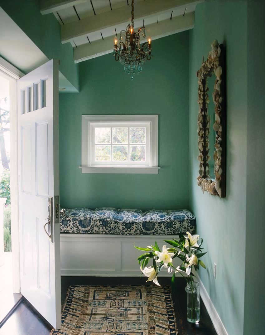 Это может быть закрытая галошница или угловая тумба. Рядом поставьте пуф или небольшой стул