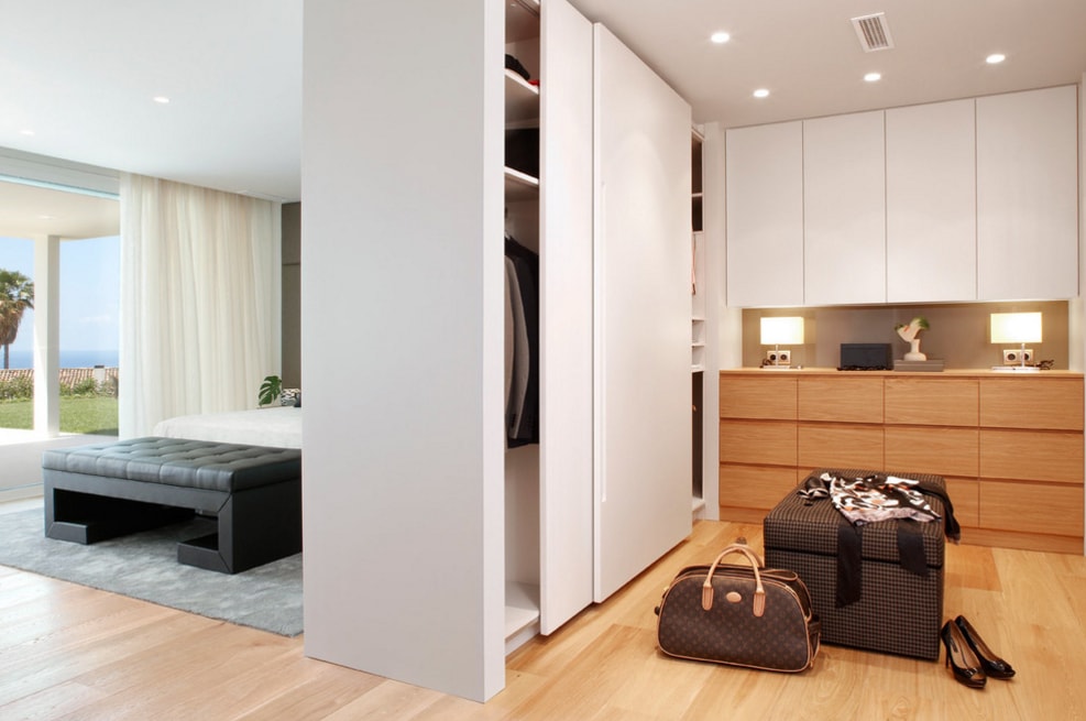 Поставить шкаф-купе между гостиной и прихожей также довольно практично с точки зрения хранения. Внутреннее пространство шкафа можно зонировать таким образом, что им будет очень удобно пользоваться. При этом все вещи в доме хранятся в одном месте, а не рассеяны по многочисленным тумбочкам, пеналам и комодам.