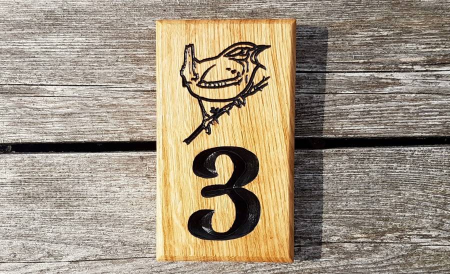 - Вырезать, выжечь или нанести краской на дереве. При владении искусством резьбы по дереву можно создать красивую табличку ручной работы с объемными буквами и рисунками. Выжигание по дереву — более легкий способ создания деревянной таблички. И альтернативный вариант: нанести на деревянную основу надпись простой краской можно с помощью того же трафарета. Для большей долговечности дерево покрывают лаком.