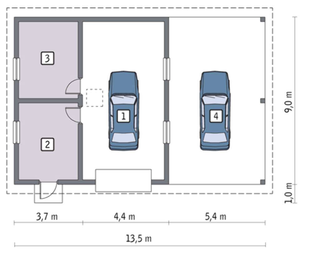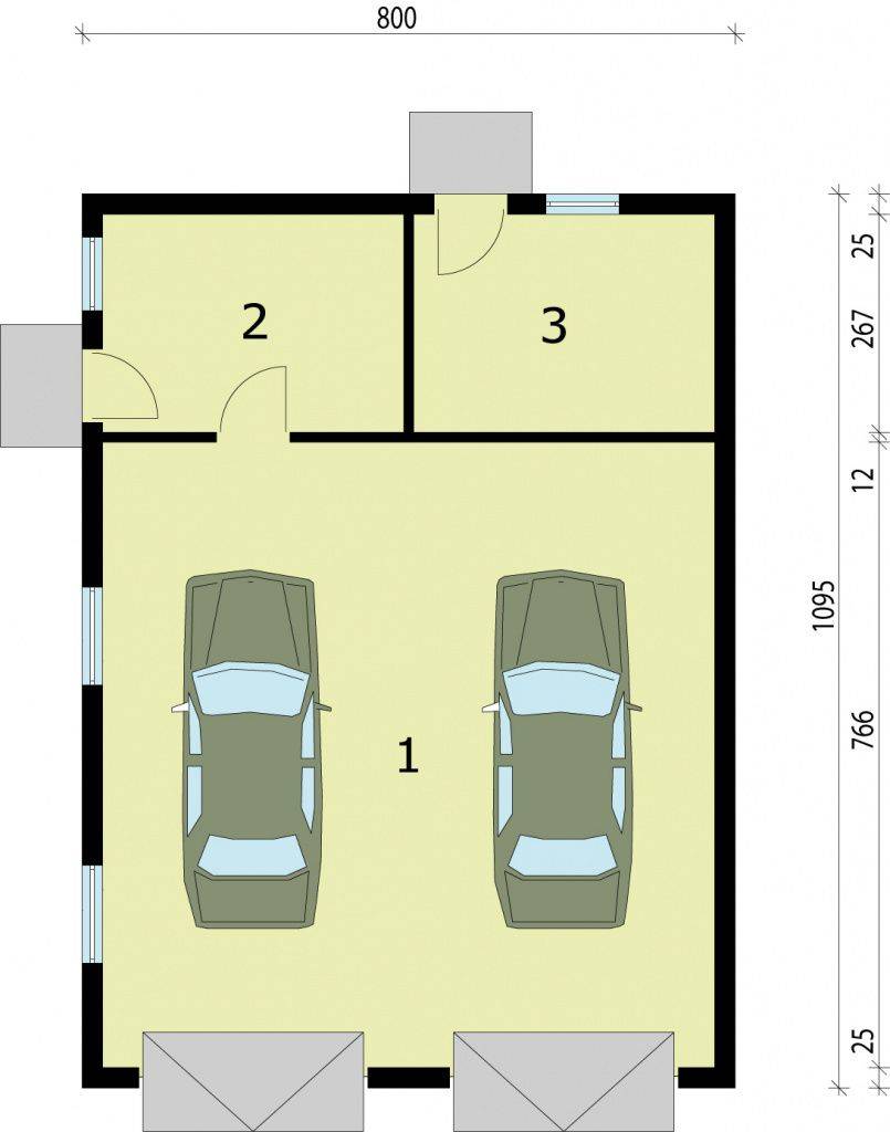Точный размер зависит от габаритов самих машин. Соответственно, для гаража на два транспортных средства нужно умножить показатели на 2, после чего прибавить расстояние между парковочными местами (минимум 50 см). Необходимо предусмотреть место для стеллажей, а также промежуток между автомобилями и стенками строения: согласно строительным нормам, он должен составить 0,5 м.