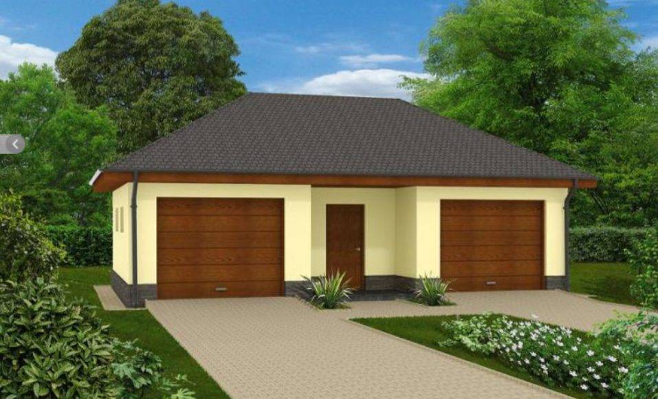 Преимуществом проекта является наличие оконных проемов как в месте парковки, так и в хозпомещении. Также для удобства имеются двери в обоих отсеках для автомобилей, ведущие в кладовую, и дверь, ведущая из среднего помещения на улицу. Входная дверь предусмотрительно расположена под навесом.
