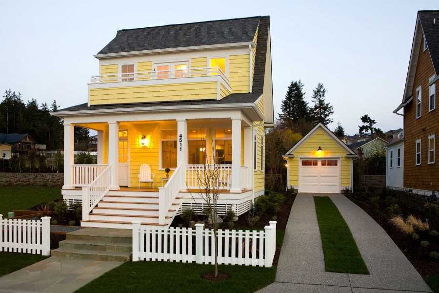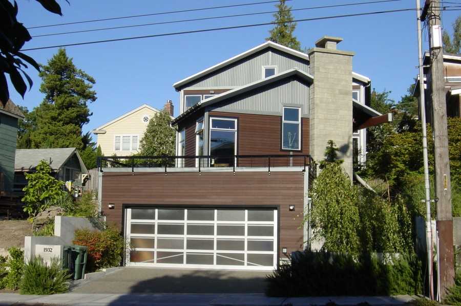 Сбоку отлично расположится гараж, ворота которого можно сделать выходящими прямо на улицу. Войти в дом можно как со стороны улицы, так и со стороны своего участка.