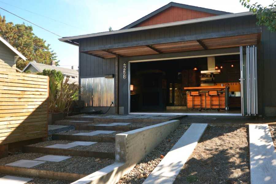 Еще один вариант такого решения — парковочное место с крышей в пристройке к дому, не имеющее входа изнутри. То есть гараж и жилые помещения разделяет глухая стена. Фактически такой гараж мало чем отличается от отдельно стоящей постройки на участке, только расположен впритык к дому. При этом хозяева экономят пространство, но избегают возможности попадания в дом неприятных запахов. Попасть в гараж можно только с улицы — зачастую вход туда расположен рядом со входом в жилую часть дома
