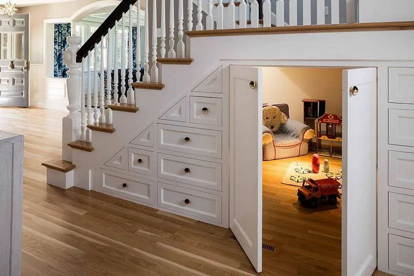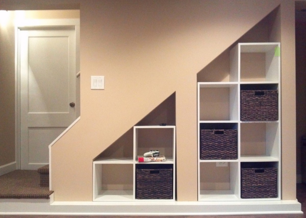 При использовании подлестничного пространства важно решить, полки там будут или ящики. Дизайнеры сходятся во мнении, что хаотично расположенные ящики и полки вместе создадут ощущение безвкусия и беспорядка. В полках или ящиках можно хранить различные мелкие вещи, посуду, одежду, коллекцию вин, инструменты и многое другое