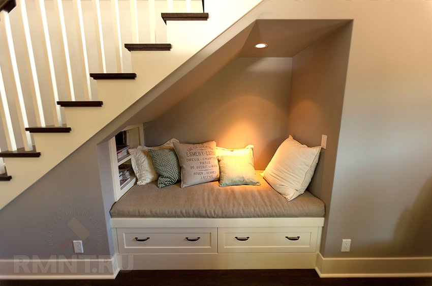 Маленький диван, утопленный в пространство под лестницей, подарит дополнительное уютное место для отдыха. Полноценный большой диван сложно вместить в это пространство, оптимальным вариантом станет размещение вдоль лестничной стенки.