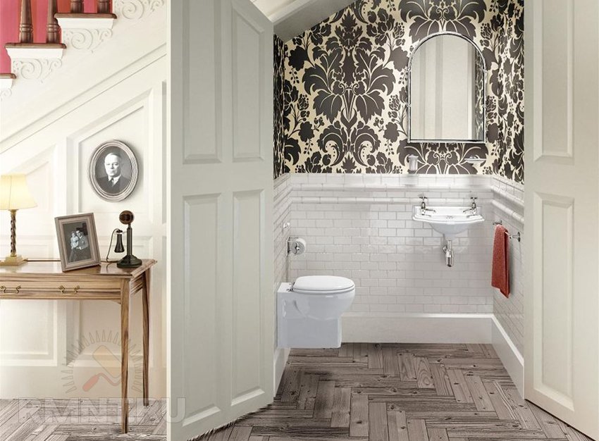 На этапе планирования туалета под лестницей обязательно продумайте систему освещения. В большинстве дизайнерских решений обычно используются настенные либо потолочные светильники плоской формы.