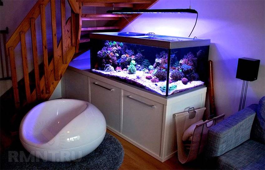 Аквариум, фонтан. Необычное, но стильное решение, для реализации которого нужно отдельно заказывать аквариум (или сделать его самостоятельно, имея терпение и определенные навыки). Воплотить такой замысел реально от $400.