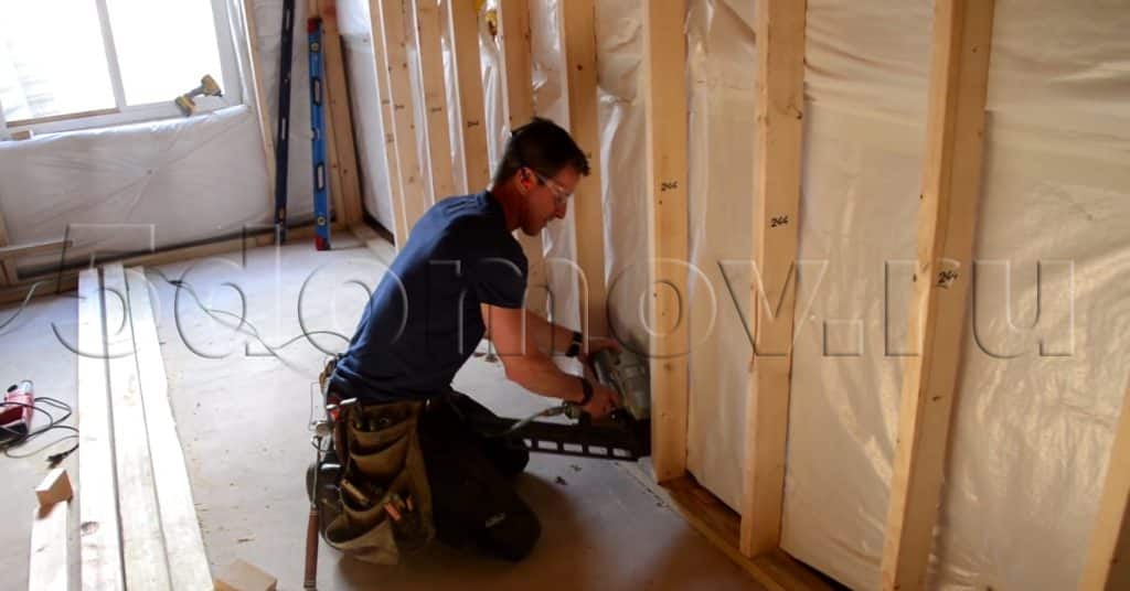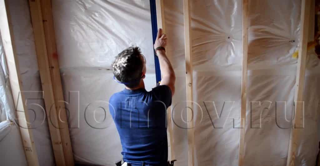 Смонтировав каркас, его поднимают к месту установки и с помощью ватерпаса делают измерения в нескольких точках стоек: нужно убедиться, что каркас строго вертикален. Чтобы крепление было прочным, вбейте клин между верхней обвязкой и потолком. Прикрепите каркас к стенам и к бетонному полу и потолку, постоянно выравнивания его точно также, как при монтаже каркаса непосредственно на стене.