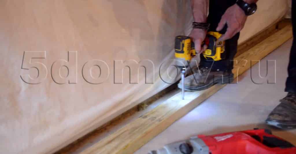 Горизонтальные рейки обычно располагают с интервалом в 400—600 мм, а вертикальные устанавливают вдоль стены таким образом, чтобы они совпадали своими центрами с краями панелей или гипсокартона. Желательно, чтобы в местах стыков ширина реек каркаса была не менее 7,5 см. Вертикальные доски или рейки прибиваются к стене гвоздями длиной не менее 7—10 см. Если стену пробить трудно, нужно просверлить отверстия и вставить пробки, а уже в них вбить гвозди.