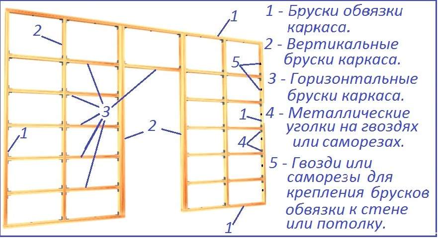 С помощью дополнительных брусков формируют углы. Горизонтальные рейки вверху и внизу стены служат опорой для галтелей и плинтусов.