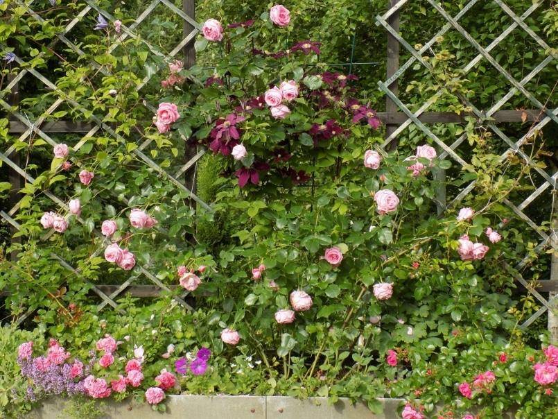 Если на участке есть другие вертикальные конструкции (беседки, шпалеры, арки), растения, украшающие их, должны гармонировать с теми, что высажены у забора. В идеале использовать одни и те же виды разных оттенков или различные растения в общей цветовой гамме.