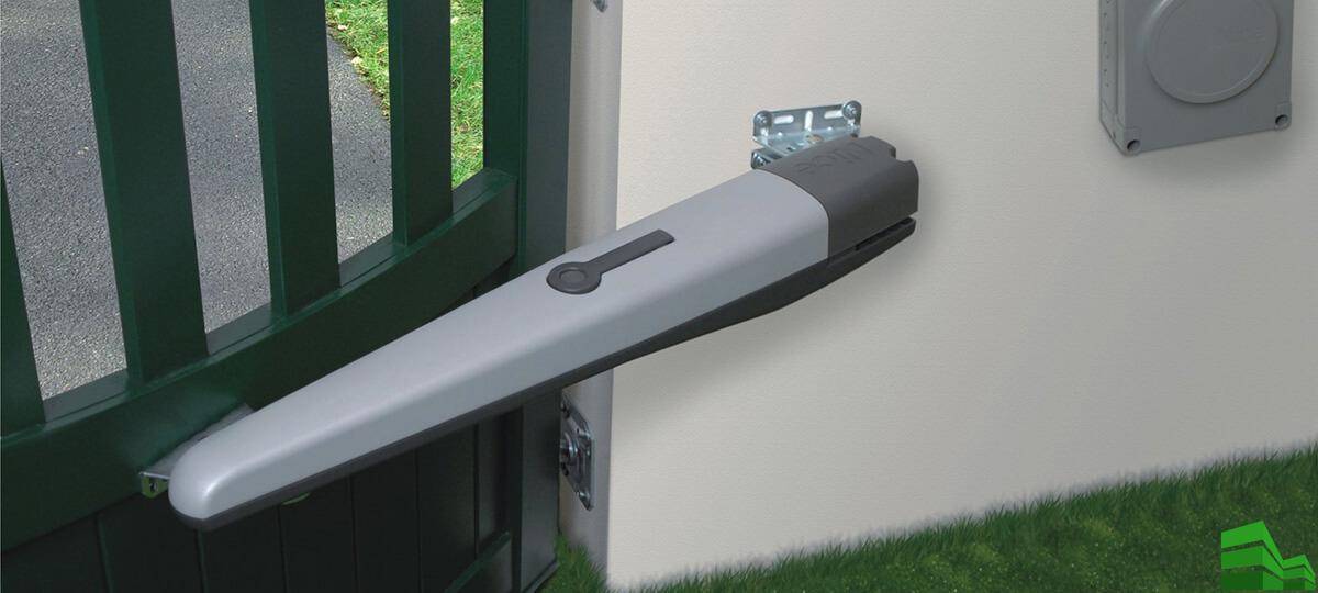 Рычажный привод состоит из двух рычагов и редуктора, спрятанного в защитном кожухе. Корпус, внутри которого находится редуктор, прикрепляется к столбу ворот, а рычаг — непосредственно к створке.