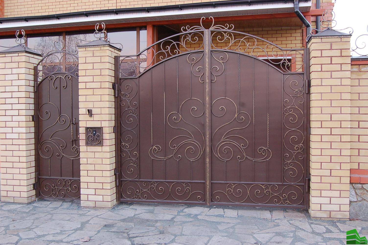 Металлические ворота с калиткой особенно изысканно выглядят, когда их украшают художественной ковкой. Они создают особую атмосферу, словно погружая в период ренессанса. Сделать собственными руками такую красоту будет сложно, здесь требуются особые навыки, инструменты и оборудование. Кроме того, здесь важны прочные опорные столбики, предпочтительнее, чтобы они были сделаны из кирпича.