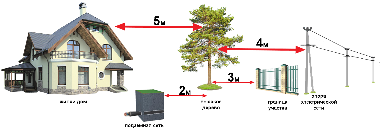 Расстояние от дерева до забора и других объектов зависит от его высоты.