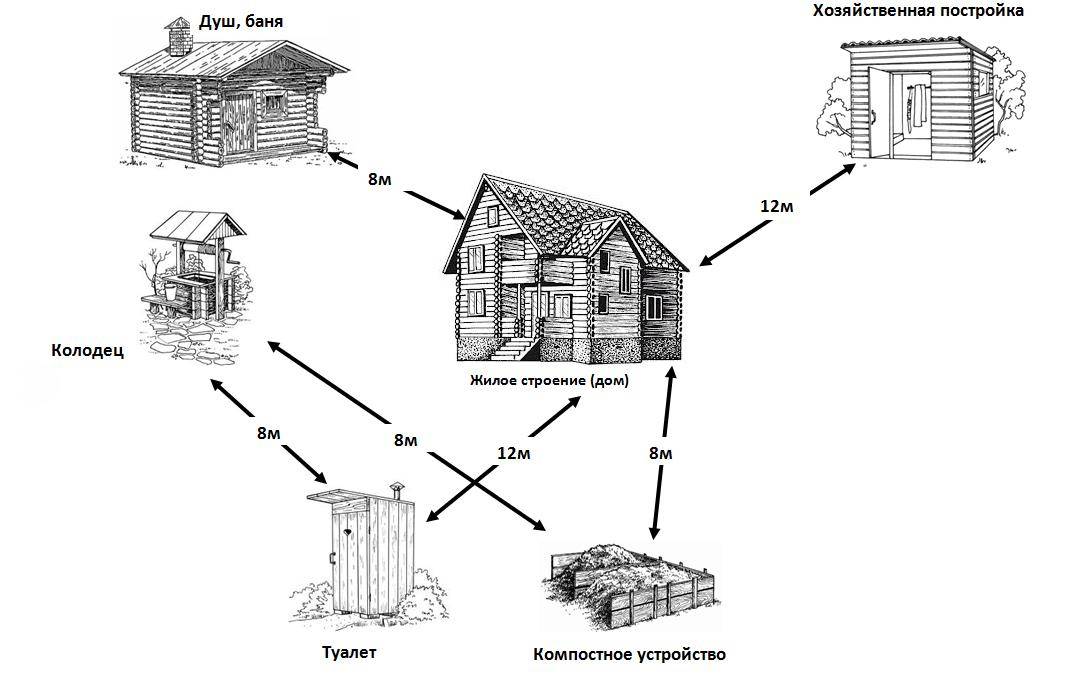 Между собой некоторые постройки тоже должны быть удалены. Например, выгребные ямы, компостные ямы, должны быть удалены от колодца или скважины на 20 метров минимум. Также не стоит бурить скважину или колодец вблизи уличного сортира, по понятным причинам.