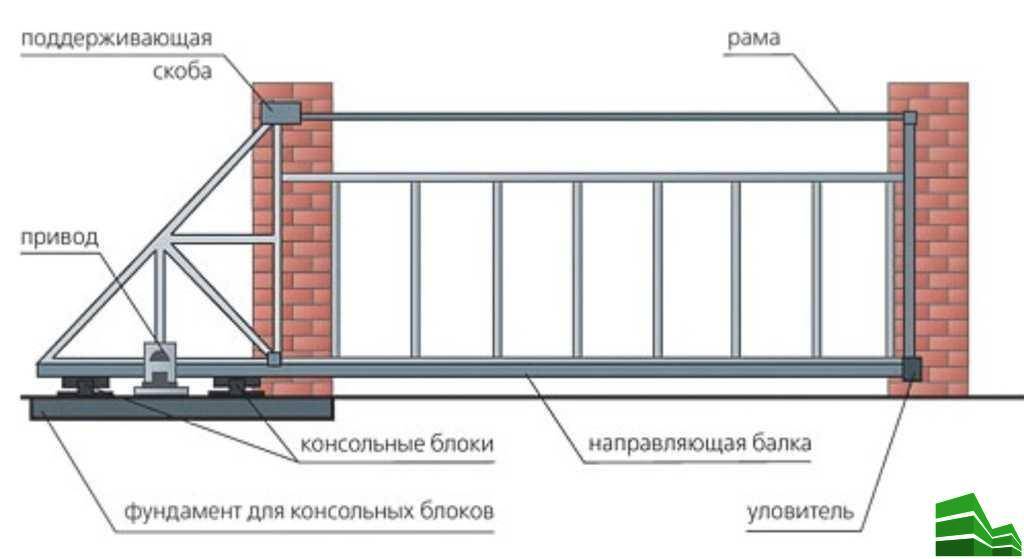 Эта конструкция хороша тем, что над проездом нет балок. Но она — самая дорогая в устройстве. Дело не столько в системе роликов, сколько в необходимости устройства фундамента с металлическими закладными, к которым затем будет крепиться консольная балка. Если столбы уже есть, фундамент заливается перед ним и вдоль забора на длину технического выноса, который необходим для компенсации нагрузки, создаваемой полотном.