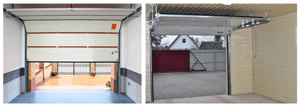 Эта модель представляет собой цельное полотно в виде щита, которое при открытии поднимается вверх, устанавливаясь горизонтально. При этом полотно будет отстоять от верхнего торца проема на 20-25 см ниже (в зависимости от производителя). Соответственно подсчитать высоту проема гаража надо точно так же, как и в предыдущем случае, только к полученному результату придется добавить обозначенный выше зазор.