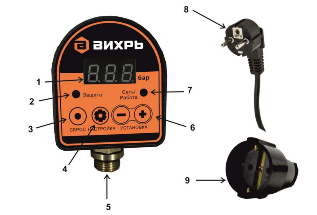 - Дисплей с индикацией текущего давления в системе и режимов настройки.